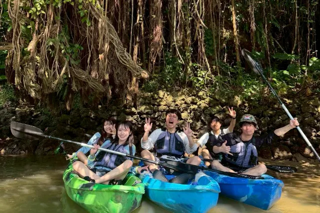 マングローブの間を通ったりして遊んだ後に、海へ出て真っ赤な夕日に浸りました。上半身の運動にもなりました。