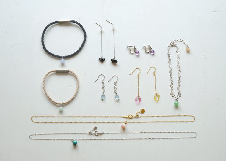 福岡県糸島市にある、タビノキセキ。ブレスレット・ネックレス・アンクレット・ピアス・イヤリングなど、様々なアクセサリーを作れます。金属アレルギーの方にもオススメ!