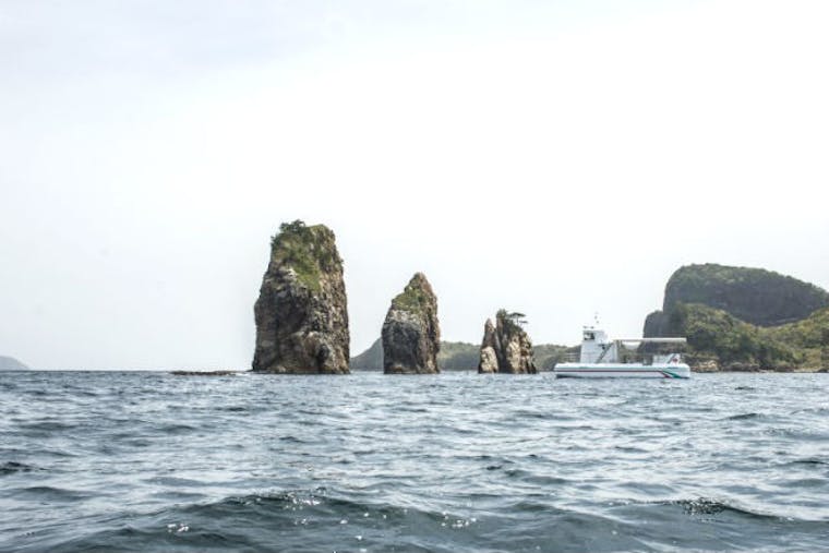 「海中展望船あまんぼう」が、菱浦港から海士町の名所「三郎岩」までの船旅へ皆様をご案内。地下の展望室からは、たくさんの魚が泳ぐ海中の様子をご覧になれます。海藻の生い茂る海の中を泳ぐ大きな魚や小魚の群れに出会え、お客様からも感動の声を多数いただいております!水族館とは違う、神秘的な本物の海中世界をお楽しみください。