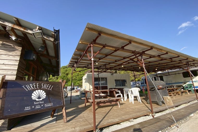 瀬戸内の穏やかな海、ビーチ長浜にある「海の家 スリーシェル」。SUP(スタンドアップパドル)やバナナボート、ウェイクボードなどのマリンスポーツはもちろん、BBQやテントサウナなどもあり、誰でも気軽にアウトドアを楽しんでいただけます。フェリー乗り場「小用港」より車で約30分。きっと最高の夏の思い出が作れますよ!