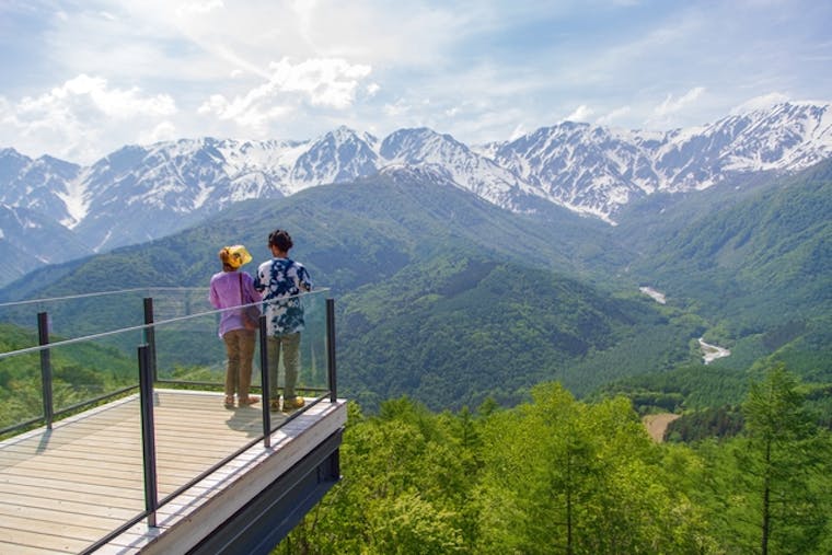 標高1,289mの絶景テラスで、北アルプスに飛び込むかのような浮遊感を体感!
