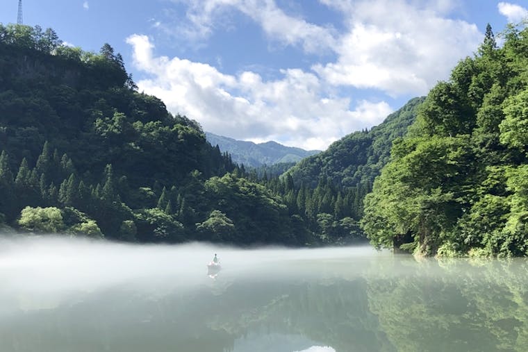 福島県金山町の只見川で、川霧が佇む絶景を和船から眺める