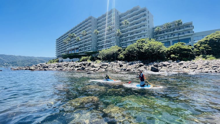他の御予約者と一緒にならずに予約毎個別対応しておりますので 家族・恋人・仲間同士で他の方を気にせず楽しめますので安心です。 (風が強く湾内対応になる時のみ安全管理対応の為、同時開催になることがあります) 南熱海の静かな綺麗な海で SUP体験はいかがですか? 普段出来ない非日常体験で大はしゃぎしましょう 海水浴では体験出来ない少し沖まで出て海上の開放感を味わって下さい。 沖から陸を見る景色は 普段見る事ない特別な景色で坂の街熱海ならではの景色が楽しめます。 サップボード・パドル・ライフジャケット・リーシュコード全てレンタルで、用意されてますので 海に入れる格好のみで遊べます。 スタンドアップパドルボートとは大きめのサーフボードの上に立ち パドルで漕ぐスポーツです カヤック・カヌーよりも目線が高いため 海上散歩しながら海の中の様子も、楽しめます。