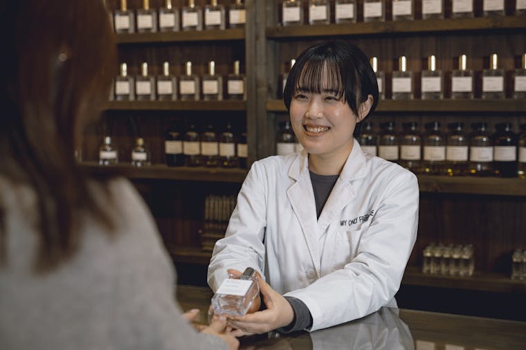 MY ONLY FRAGRANCEでは、フレグランスアドバイザーが専属でアドバイスいたします。 まずは直感で選んでいただき、その後、香りの種類や調合量などお客さまのお好みをお伺いします。 ひとつひとつアドバイスし、世界にひとつのお客さまの香りが完成するまでお手伝いいたします。 これまで数千人というお客さまにフレグランスを調合してきたノウハウや技術をベースに、お好みの香りをアドバイスいたします。 お客さまのイメージをしっかりとお伺いし、笑顔になっていただける香りをご一緒につくります。 フレグランスの主成分であるエタノールには、自然素材を発酵してつくられたエタノールを使用しており、安価な化粧品に使用される、合成アルコールなどは使用しておりません。 また、香りにもこだわり、一つ一つがアロマのような単一の香りではなく、トップ、ミドル、ベースと考えられたフレグランスとなっております。 MY ONLY FRAGRANCEの香りは、ハイブランドと遜色ないと自信をもってお客さまにお届けしております。 ~ 体験の流れ~ 店内に並ぶ数十のフレグランスからお好きな香りを複数選ぶ 香りをムエットで確かめながら割合を調整。 その場でひとつひとつ調合。 お客さまだけの世界に一つの特別な香りをおつくりします。 フレグランスにお名前をつけていただきラベルを貼って完成。