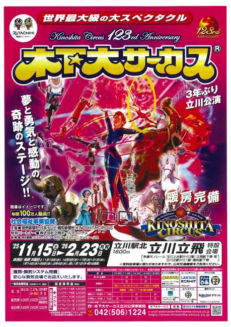 1. **伝統的なパフォーマンス** 100年以上の歴史を持ち、空中ブランコやアクロバット、ジャグリングなど、サーカスの王道ともいえる演技が楽しめます。 2. **動物との共演** 可愛いポニーや、象などの動物たちが登場し、華麗な演技を披露。これらの動物たちとの共演が、観客に大きな感動を与えます。 3. **家族向けエンターテイメント** 幅広い年齢層が楽しめるように構成されており、子どもから大人まで一緒に楽しむことができるショーです。 4. **迫力ある演技と技術** アクロバットや空中ブランコなど、技巧的なパフォーマンスが圧倒的な迫力を持って観客を魅了します。 5. **特別な舞台演出** サーカステントの中で繰り広げられるショーは、観客との距離が近く、臨場感や独特の雰囲気が楽しめます。 これらの要素が融合した木下大サーカスは、伝統を大切にしつつも常に新しい感動を提供するエンターテイメントです。