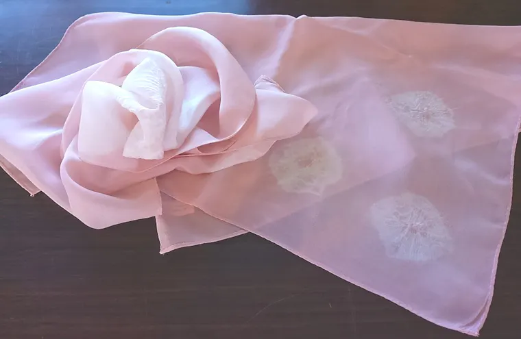 命を終えて地面に落ちた椿の花びらから染液を作り、シルクストールやスカーフを染めます。布を折ったり絞ったりして模様をつくり、椿のやさしい色を布に写し取ります。模様や色合いは一つひとつ異なり、世界に一枚だけの作品が生まれます。初心者の方でも気軽に参加でき、完成した作品はそのままお持ち帰りいただけます。