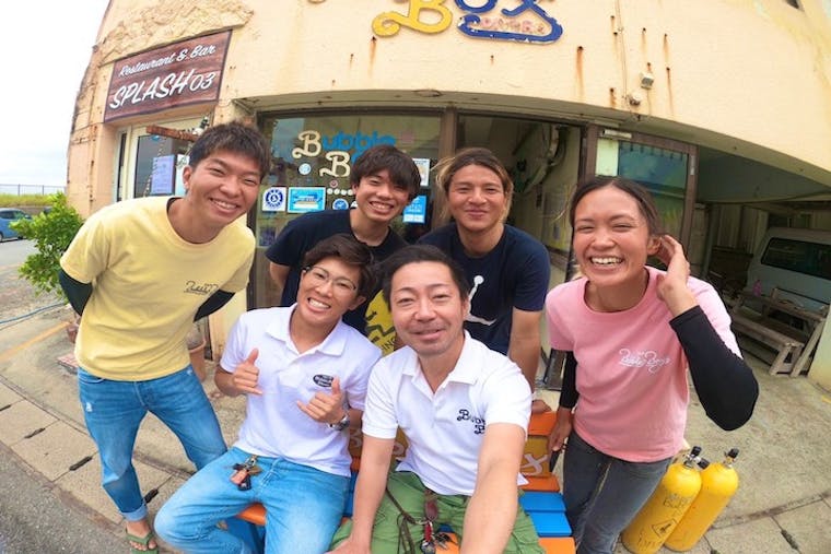 バブルボックスダイバーズは、沖縄中部・北谷町のダイビングショップです。目の前には海、周辺には地元の人や観光客でにぎわうショッピングスポット・アメリカンビレッジがあります。 「楽しい沖縄ライフとダイビングライフ」が合言葉。 当店のスタッフはとてもフレンドリーで、常に笑顔があふれています。沖縄に初めて訪れるお客様を笑顔でお出迎え。記念日などの方には、スタッフ一同からのサプライズも!?また、沖縄出身のスタッフもいるので、海や生き物の紹介はもちろん、陸でのサポートもお任せください!ご迷惑でなければ、おみやげ選びもご一緒いたします。 海が大好きなスタッフがご案内します! 代表の水田は、海が大好き。15年以上前、沖縄の海に魅せられて移住してきました。沖縄の海の魅力を多くの方にお伝えしたいという想いで、常にお客様第一でお店を続けてきました。シュノーケリングでは美しい青の洞窟にご案内。ご家族で楽しんでいただけます。美しい海を好きになってもらえるように、全力で海の魅力をお伝えします! 女性スタッフも常駐しておりますので、女性お一人でのご参加でも安心です。ぜひお越しください!