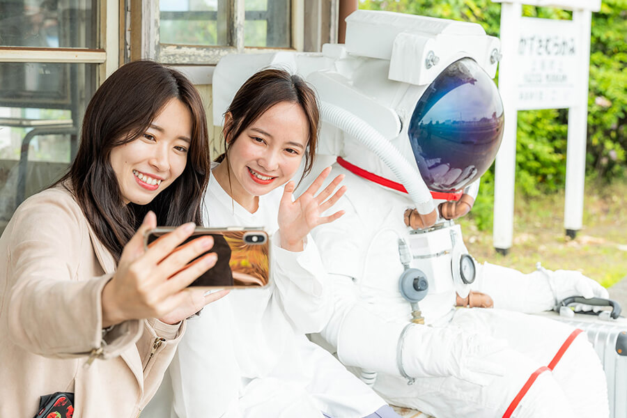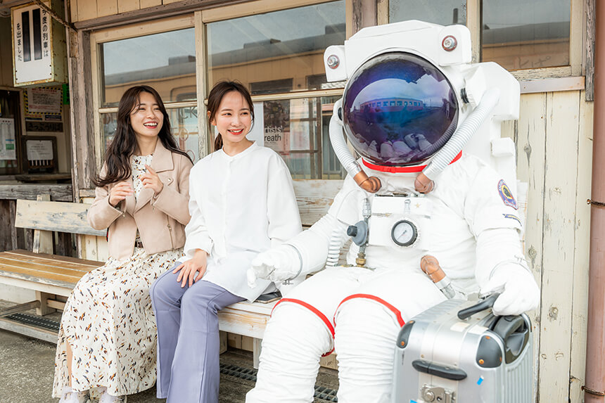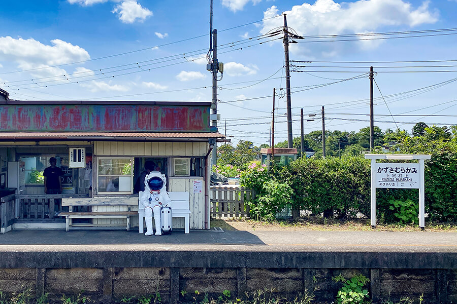 小湊鉄道を銀河鉄道に見立て、五井駅からの7駅に、月と宇宙を題材にした様々な作品が展開されています。駅のホームにポツンと座る宇宙飛行士と電車、青空との組み合わせは写真映えすること間違いなし!