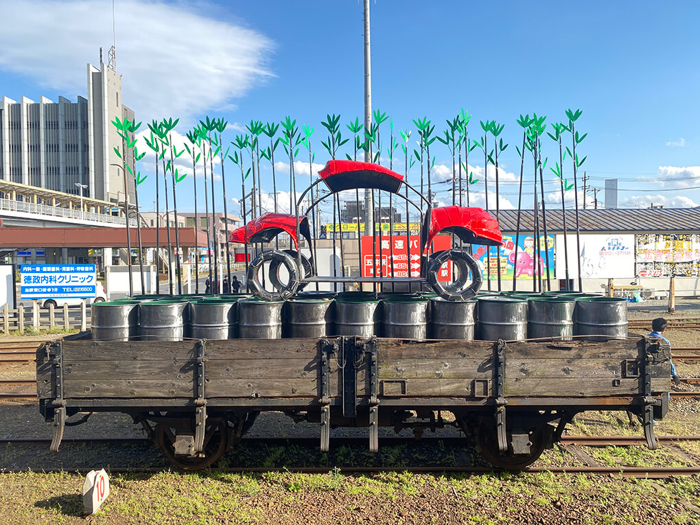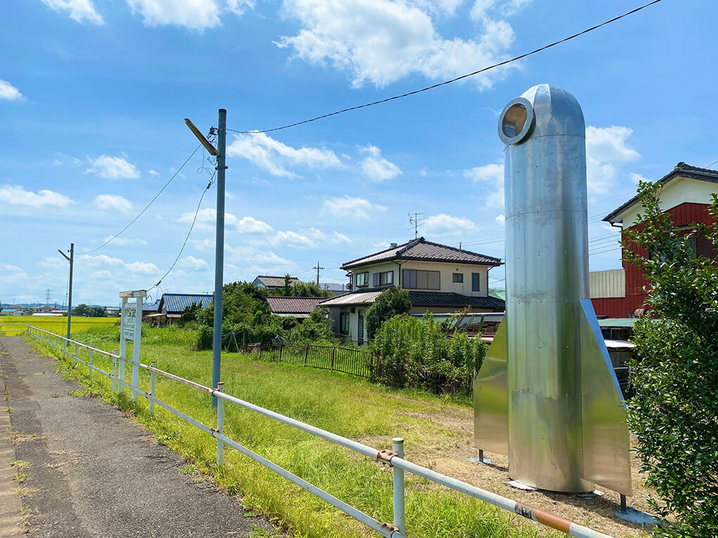 駅のホームの外に、青空に向かってそびえ立つ宇宙ロケット。丸みを帯びたロケットが田園風景の中に佇む姿は少し可愛らしくも見えます。アート旅の始まりを感じさせる作品です。