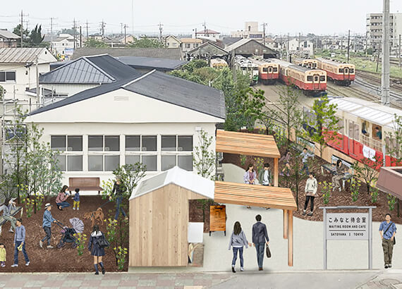 駅前広場として、人と自然、建築が溶け合うように様々なデザインの建物が並びます。建物の扉を開けると、なんと!そこはトイレ。展望台もあり、小湊鉄道や市原の風景を撮影するのにもピッタリです。トイレと一緒に楽しんでみてください。