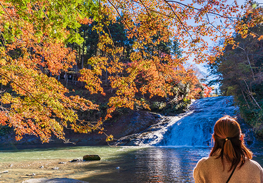 紅葉が渓⾕を彩り、滝と渓流の絶景が楽しめます。