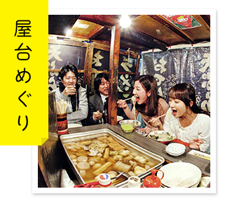 福岡といえば、屋台! のれんをくぐれば人情味あふれる雰囲気と美味しいものに出会えます。主な屋台スポットは、天神、中洲、長浜。市内には約120軒の屋台があります。夕方になると、カラフルなのれんの屋台がずらりと並び、仕事帰りのサラリーマンや観光客で賑わいます。屋台のジャンルは様々で「博多一口餃子」や「とんこつラーメン」など福岡ならではの名物料理の他、「焼ラーメン」や「明太子卵焼き」などオリジナルのメニューを揃える屋台もたくさんあります。一晩に一軒とはいわず、二軒三軒はしごして、福岡の夜を楽しんでください。