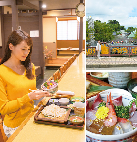 富山県氷見市は県内有数の漁師町。富山湾の新鮮なお魚を食べるなら氷見へ。定置網漁で水揚げされる魚は四季を通じて約200種類。早朝氷見漁港で水揚げされた魚は、すぐに運ばれ、昼には料理として提供される。獲れたての天然の魚は、鮮度抜群、美味しいことは間違いない。その富山湾の魚5種を盛り付けた定食が中心市街地の各店で食べられる。また干物やスイーツなど、氷見ならではのお土産を手にいれ、まちなかの食べ歩きを楽しもう。地元のボランティアガイドさんがまちなかを案内してくれる。