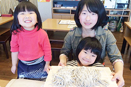 和傘の先端部分と同じ構造の骨組みに、藍染めやちぎり和紙を張り付けた傘用の和紙を骨に貼りつけます。先端に保護用の和紙を被せたあとにドライヤーで乾かしてランプシェードの完成です。