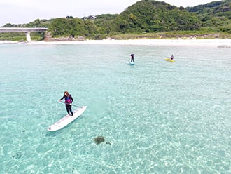 SUPで角島の綺麗な海を楽しもう!波があればサーフィンも可能です。ドローンによる撮影付きで、思い出に残る体験に。