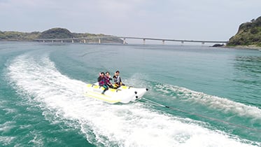 観光スポット角島をバナナボートで遊覧。海上から、ならではの絶景が楽しめます!ドローンによる撮影付きで、思い出に残る体験に。