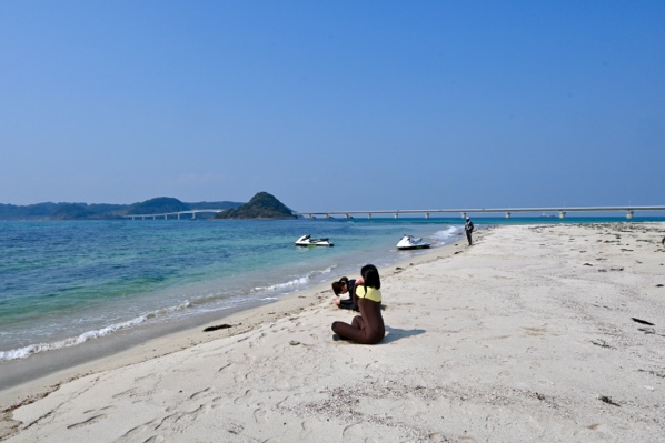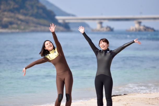 そんな角島の海を漂流するアクティビティを体験してもらうのは、こちらの二人組!下関在住の清水麻帆さんと北九州在住の苅北晴香さんです。