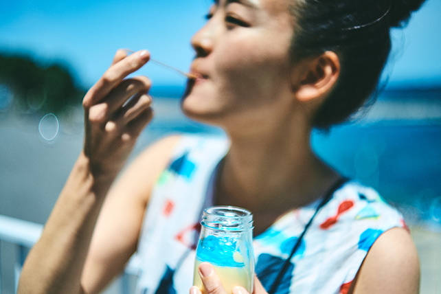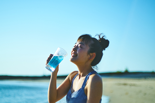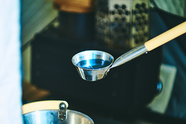 角島ブルーなサウナ!ロウリュに使用するのは、神秘のブルーハーブティー「Butterfly Pea」。サウナドリンクは、「つのしまサ動」オリジナルの角島ブルーハワイ