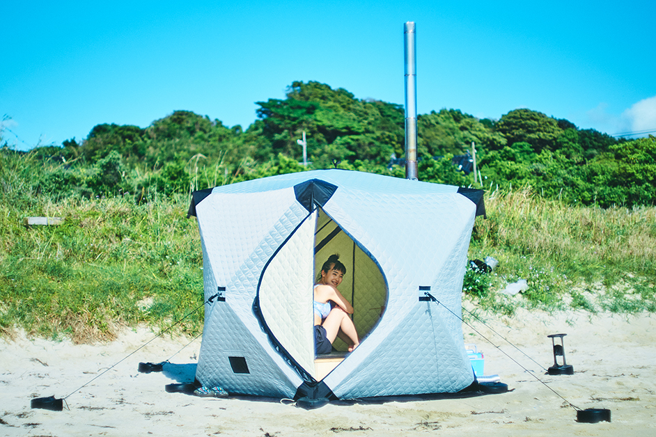 海から上がったら、白い砂浜に設置されたテントサウナへ!