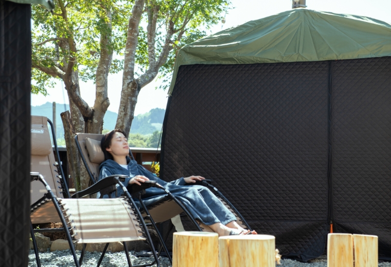 オクシズエリアにある古民家をリノベーションしたテントサウナ施設。四季折々の景色と自然のくつろいだ空間の中でサウナを楽しむことができます。初心者の方には入り方から教えてくれます。