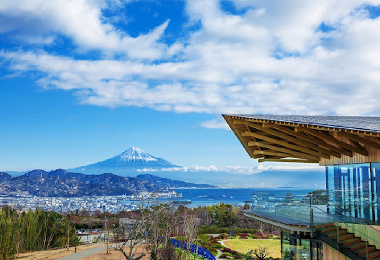 標高300mの丘陵地で、駿河湾越しの富士山、清水港、伊豆半島、南アルプスのパノラマビューを望める施設。3階の展望フロアの他に、1階には日本平の歴史や文化の展示、2階には景色を楽しみながらくつろげるラウンジスペースがあります。