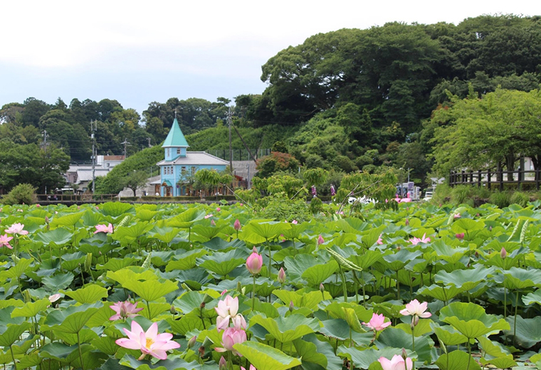 「花・水・鳥・笑顔」がテーマの公園。四季折々の花が咲きほこり、一年を通して様々な花を見ることができます。 特に、夏には名前の由来となるハスの花が池に浮かびます。園内には、遊具はもちろん飲食店、野外音楽堂など子供から大人まで楽しめます。