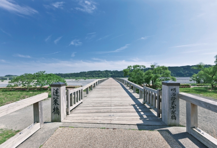 大井川にかかる蓬莱橋。全長897.4メートルと「世界一の長さを誇る木造歩道橋」としてギネスにも認定されています。長い木=長生きの橋、全長897.4(やくなし=厄無し)の語呂合わせで縁起のいい橋として人気があります。天気の良い日には富士山を見ることが出来ます。