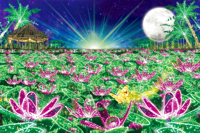 \植物園ならではの温もりあふれるイルミネーション/南国の植物園ならではの魅力を活かし、ヤシの木やハイビスカスなどの植物をモチーフに。なかでもおすすめは、蓮の花をモチーフにした幻想的なイルミネーション!水面に映ることでより幻想的な光を演出。2025年は「南国の海と花が広がるひかりの楽園」をテーマに、南国の雰囲気に包まれた光の世界へと皆さまを誘います。