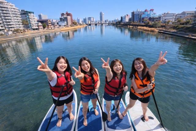 【高知市中心部】龍馬も泳いだ鏡川でSUP体験。ひろめ市場まで徒歩8分、温泉徒歩3分。女子旅にオススメ!!有資格インストラクターで安心。