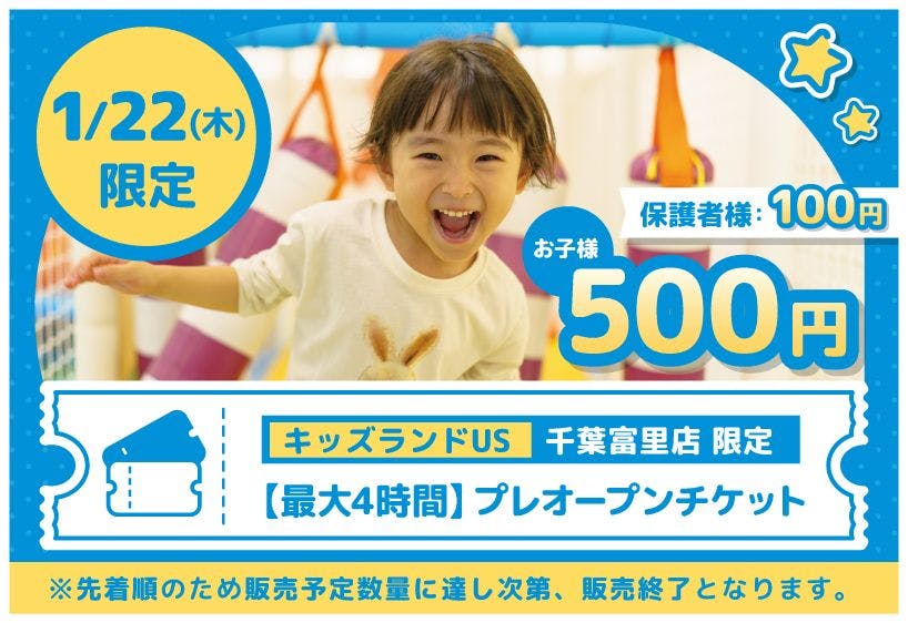 【先着】1/22(木)プレオープン最大4時間プラン キッズランドUS 千葉富里店