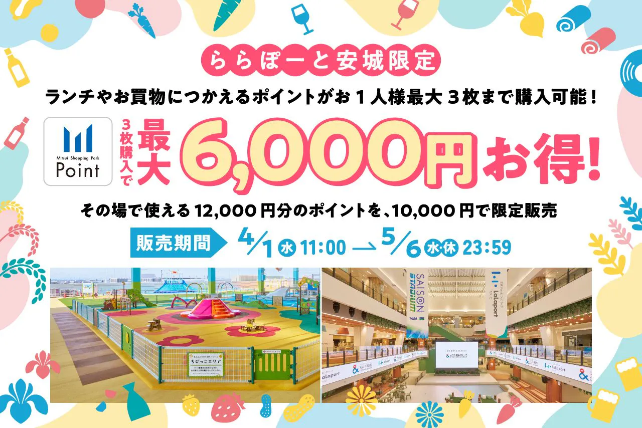 【最大6,000円OFF】ららぽーと安城で使えるポイント12,000円分を10,000円で販売!