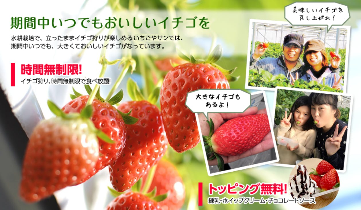 いちご狩り時間無制限 トッピング無料(練乳、チョコ、ホイップ、etc.) 無料大駐車場完備 水洗トイレ、多目的トイレ完備