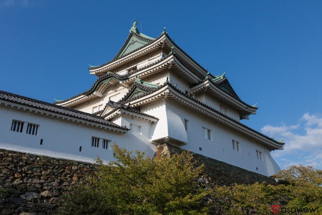 1585年、豊臣秀吉の弟・秀長が築城した和歌山城。普請奉行を築城の名人・藤堂高虎が務めました。和歌山市のほぼ中心に位置する虎伏山(とらふすやま)に建てられ、北側に流れる紀の川が天然の堀になっています。江戸時代には徳川御三家の1つ紀州徳川家が居城とし、城下町が栄えました。虎伏山に登り、山頂に建つ白亜の三層・三階の大天守閣から和歌山市街を望みましょう。天守閣だけでなく、石垣も要チェックです。紀州特産の青石(緑泥片岩)が多く使われているのが特徴。ほかの用途に使われていた石を再利用する「転用石」や、約170種類2100個以上もの刻印入りの石も見られます。