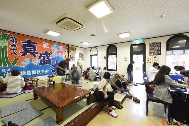 最後は、さらに西へ約40分、最終目的地・境港にある「お食事処かいがん」でランチです。地元の人を始め、舌の肥えた漁師さんも通う行列必至の1軒です。店内は小上がりの座敷&テーブルが約50席とかなりの広さ。それが開店後あっという間に満席になるので、人気の高さが伺えます。