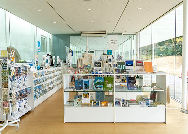 本館入口のすぐ横にあるミュージアムショップでは、展示作家や海にちなんだグッズが豊富に販売されています。店内はガラス張りで、ここから見える眺望も格別です。海の広場と東京湾が見渡せます。
