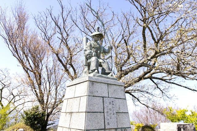 山頂展望台のすぐそばにある「源頼朝公ブロンズ像」。頼朝公が葛城山で鷹狩りをしたという言い伝えにちなんで造られました。