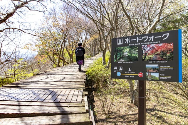 山頂では「山頂展望コース」や「ボードウォーク」など、初心者でも気軽に楽しめる5つのなだらかな遊歩道が整備され、コースによって趣の違うロケーションが楽しめます。1コース120〜180mで、それぞれ3〜8分程度で回れる気軽な散策コースです。ここでは遊歩道内にあるおもな名所を紹介します。