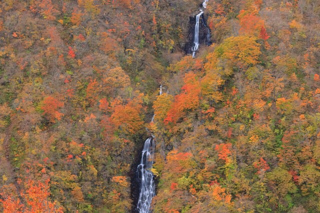 「滝見台」は、不動滝と地蔵滝、三階滝を全て眺められる絶好のスポット。落差53.5mの不動滝とその上にかかる地蔵滝、そして落差181mの三階滝は、どれも大迫力です。紅葉の季節になると滝のまわりが赤く彩られ、忘れられない絶景となります。