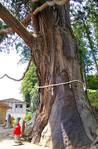 「平沢弥陀の杉」は、宮城県指定天然記念物の巨大な杉の木。その高さは約45mを誇り、幹の周りの長さは約10m、樹齢はおよそ900年といわれています。奥州藤原氏が丈六阿弥陀堂(じょうろくあみだどう)の建立時に植樹したと考えられており、周辺で「だるま講」という安産信仰が広まったことから「だるま杉」とも呼ばれています。