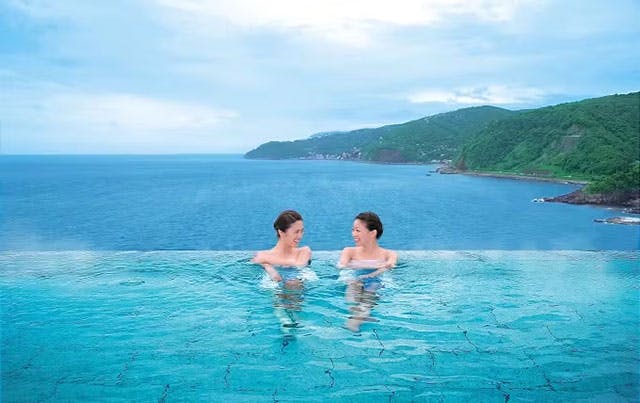 赤沢温泉郷は、伊豆高原の森と太平洋に囲まれたロケーションに広がるスパリゾート。空と海と湯舟が一体に見える眺望抜群の大露天風呂が人気で、肩までゆっくりお湯に浸かるとまるで海に抱かれているような一体感が楽しめます。ちなみに大浴場は、3階と4階で男女日替わり。どちらの階でも絶景露天風呂が楽しめますが、気になる人は公式サイトの「温泉カレンダー」で予定をチェックしておきましょう。