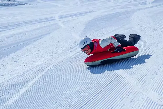 群馬県みなかみ町のゲレンデで楽しめる「エアボード体験」は、新感覚スノーアクティビティ。専用の空気入りボードにうつぶせで乗り込み、雪の上を自由自在に滑り降りる爽快感が魅力です。