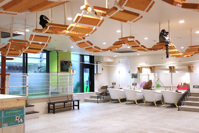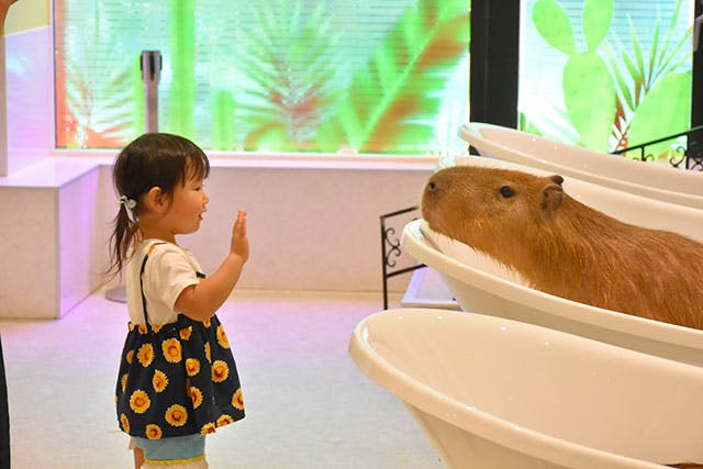 「カピバラとワオキツネザルの部屋」には「カピバラの猫足風呂」を設置。「アニタッチ」をプロデュースしている「伊豆シャボテン動物公園」では、“伊豆冬の風物詩”ともいわれる「元祖カピバラの露天風呂」が有名ですが、土地柄を反映し、「アニタッチ 東京ドームシティ」では都会的で洗練されたお風呂にアップデート!お湯の中でホカホカするカピパラ姿の癒やし効果は想像以上で、気づけば親子で頬をゆるませながら長時間眺めてしまいます。
