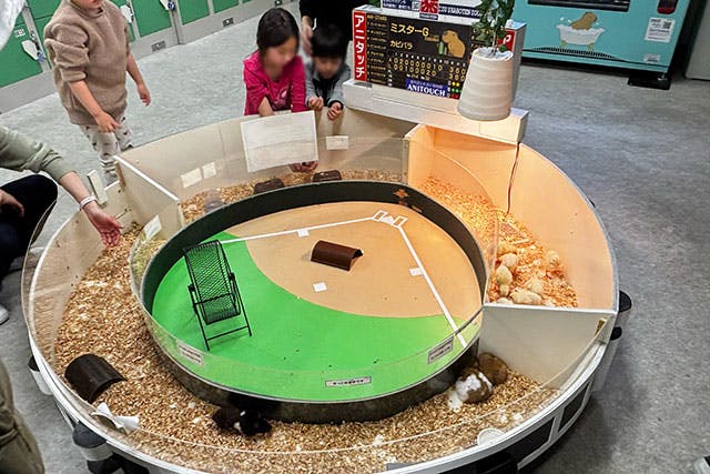 エントランスから入ってすぐのメインエリアは、「アニタッチ」名物のご当地オブジェ“東京ドーム”が目印。モルモットやパンダマウスといった小動物たちから、ミミナガヤギにマイクロブタ、さらに爬虫類たちと出会えます。しゃがんだり、踏み台が用意されるなど、子どもはもちろん家族全員が動物たちと同じ目線で出会える工夫がいっぱいです。