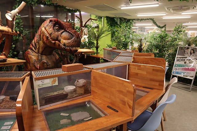 さらに「WORK SPACE with DINOSOUR」も併設。巨大な恐竜オブジェに見守られながら、小動物たちが動き回るスペースを目の前に、仕事→癒し→仕事→癒しの無限ループが叶います。電源と無料Wi-Fi完備と至れり尽くせり!宿題・仕事・休憩と自由に使えますよ。