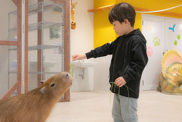 都内最大級の約1,200平方メートルの広さを誇る館内は、メインエリアがとにかく広大! そして営業時間内であれば時間制限ナシ。順路がなく館内を自由に歩き回れ、子どもたちのペースで時間をかけてじっくりゆったり楽しめます。最初緊張していても、10分ほどエリア内にいれば誰もがその優しい雰囲気で慣れてくるのも不思議!動物たちの優しさや癒しを全身で感じ、受け止めてくださいね。