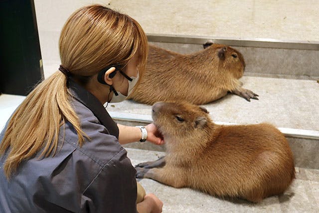 「カピバラとワオキツネザルの部屋」には「カピバラの猫足風呂」を設置。「アニタッチ」をプロデュースしている「伊豆シャボテン動物公園」では、“伊豆冬の風物詩”ともいわれる「元祖カピバラの露天風呂」が有名ですが、土地柄を反映し、「アニタッチ 東京ドームシティ」では都会的で洗練されたお風呂にアップデート!お湯の中でホカホカするカピパラ姿の癒やし効果は想像以上で、気づけば親子で頬をゆるませながら長時間眺めてしまいます。