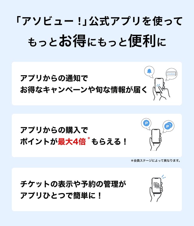 アソビュー!アプリで予約・購入するだけで、会員ステージごとに付与されるポイントよりポイント付与率が+3%アップ!
