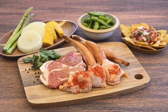 「今日はちょっと良いお肉を持ち込んでBBQを楽しみたい!」そんなこだわり派の方には、こちらの「地下でお肉を買ってBBQプラン」がおすすめです。日本橋高島屋S.C.本館地下1階の生鮮食品売場で、お好みの肉や魚介類を購入して持ち込むことができます。プランには、野菜(スイートコーン、グリーンアスパラ、玉ねぎ)とおつまみ(カプレーゼ、枝豆、スパイシーナチョス)が付いており、さらに120分の飲み放題も楽しめます。こちらはWeb予約限定で、お一人様5,000円。自分だけのオリジナルBBQを楽しんでみませんか?