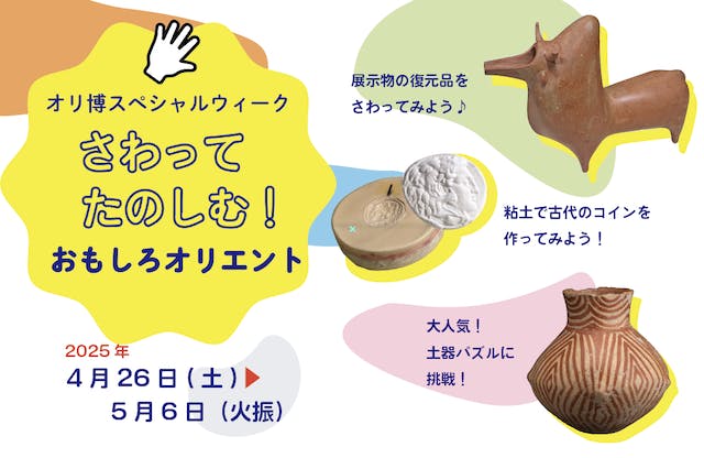 毎年恒例のGW特別企画「オリ博スペシャルウィーク さわってたのしむ!おもしろオリエント」が、2025年4月26日(土)から5月6日(火・振)まで開催されます。古代のハンコ(レプリカ)を押す体験や古代衣装体験など、子どもから大人まで楽しめる体験が盛りだくさん!見るだけでなく、実際に触れることで、古代オリエントの歴史文化をより身近に感じられるはずです。