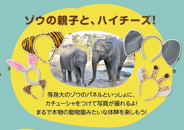 会場には、なんと等身大のゾウのフォトパネルが登場します!さらに、動物の耳がついたカチューシャの貸し出しもあるので、ゾウさんになりきって記念撮影を楽しめます。家族や友達と思い出の一枚を撮影してみてはいかがでしょうか?SNS映えもばっちりですね!
